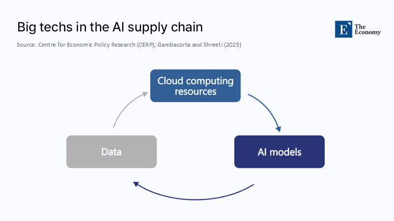 Figure 2 illustrates the feedback loop that now defines the industry. Data feed cloud; cloud trains models; models generate new data that further enrich cloud platforms. The flywheel is powered by scale economics Europe does not currently possess, and by permissive regulatory sandboxes the continent has not yet created.
