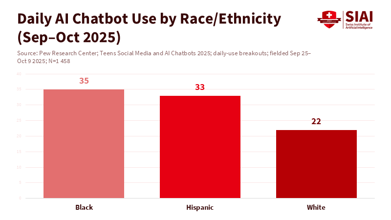 Figure 2: Black and Hispanic teens are ~50% more likely than White peers to use chatbots daily, sharpening the case for teen-mode guardrails that work across contexts.