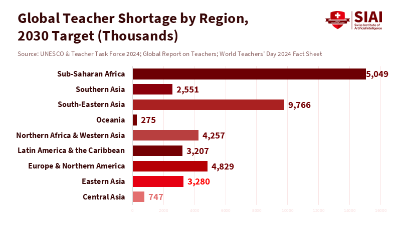 Figure 2: Meeting universal schooling by 2030 requires ~44 million teachers; Sub-Saharan Africa (15,049k) and South-Eastern Asia (9,766k) account for over half of the gap—underscoring why AI agents should target routine workload, not replace scarce experts.