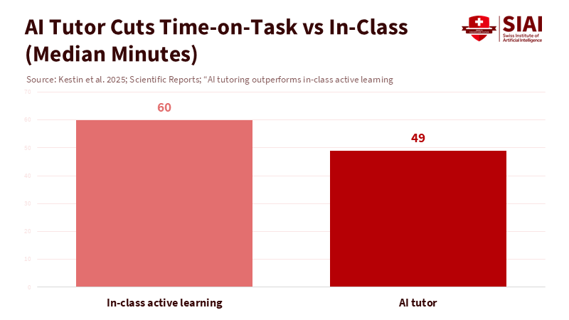 Figure 1: Students using the AI tutor spent 49 minutes on task versus 60 minutes in class—about 18% less time—while the same study reports significantly larger learning gains for the AI-tutored group.