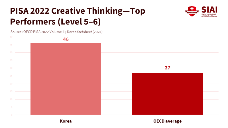 Figure 2: Korea’s top-performer rate is ~2× the OECD average—strong “little-c” creativity at age 15, not yet proof of adult problem-framing power.