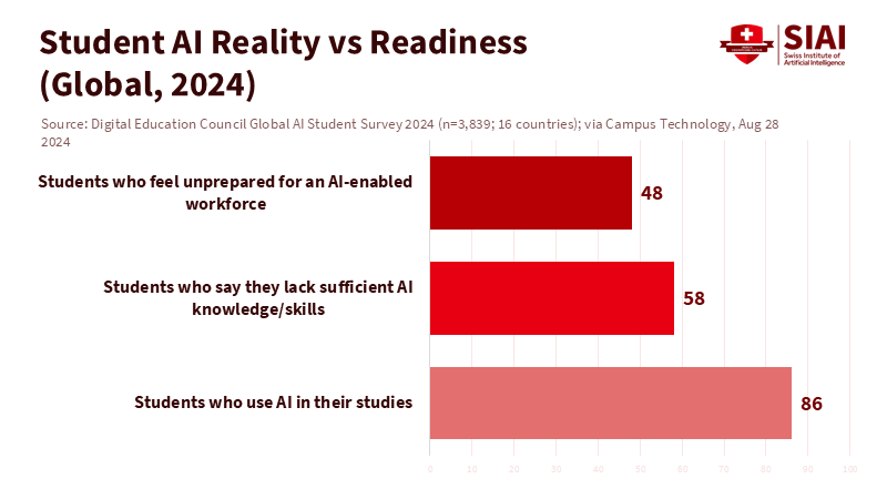 Figure 2: Usage is high, but literacy and workplace readiness lag—why assignments must measure process and verification.