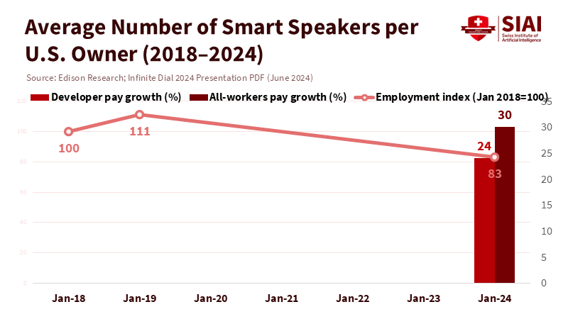 Labor-market signals reflect this shift. In the United States, payroll data indicate that by January 2024, the number of software developers employed was fewer than it had been six years earlier, despite the sector's historical growth. Wages for developers also rose more slowly than for the overall workforce from 2018 to 2024. This doesn't represent the entire economy, but software is at the forefront of experiencing the earliest effects of AI. When a sector that once employed thousands of juniors is shrinking, we should expect consequences across business services, cybersecurity support, and IT operations. This creates a more significant pay gap for those who remain in the workforce.