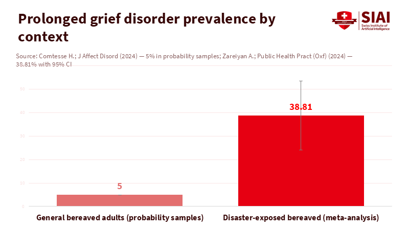 Figure 1: Most bereaved people adapt; rates surge after disasters—supporting low-cost, targeted tools like governed AI grief companions.