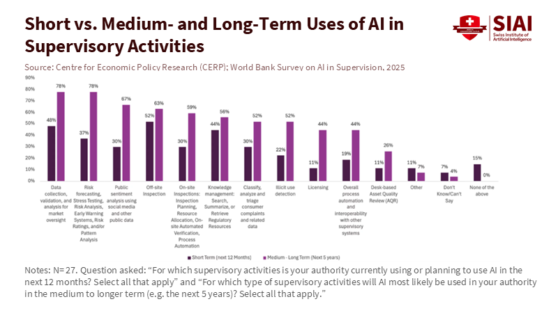 The global picture is inconsistent. By 2024, three out of four financial authorities in advanced economies had deployed some form of supervisory technology. In emerging and developing economies, that figure was 58%. Most authorities still depend on descriptive analytics and manual processes, but interest in more advanced tools is growing rapidly. A recent survey found that 32 of 42 authorities are using, testing, or developing generative AI; around 60% are exploring how to incorporate AI into key supervisory workflows. Still, the proportion of countries using generative tools in supervision stood at just 19% in 2024. Adoption is happening, but readiness remains the primary constraint.