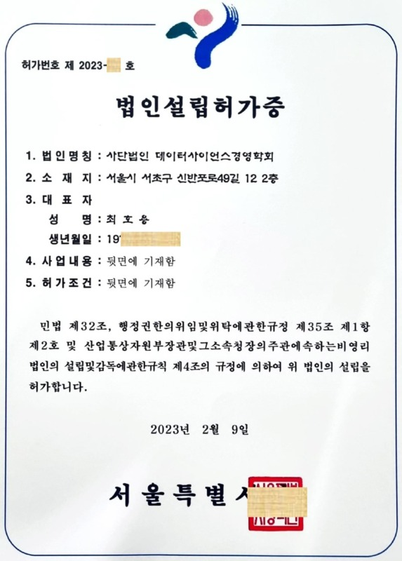 The Managerial Data Science Association (MDSA), chaired by KAIST technology management professor Ho-yong Choi, announced on February 9 that it had received permission to establish an incorporated association from Seoul City Hall. Subsequently, the corporation was established on March 9th.