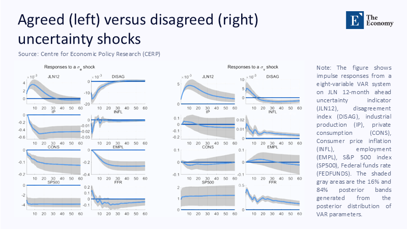 The CEPR study that inspires this column crystallises the distinction between agreed and disagreed uncertainty. The former is the textbook notion: all risk is recognized and weighted identically. The latter adds a wedge of consumer disagreement—different probability weights applied to the same objective fog. By embedding survey-based dispersion into a Bayesian VAR, the authors demonstrate that when uncertainty spikes amid high disagreement, the output costs are muted compared to episodes in which households feel equally dark about the future.