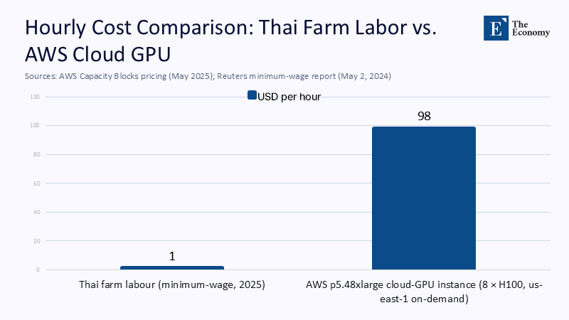 Renting just one hour of cloud time on an AWS p5.48xlarge server stocked with eight H100 GPUs costs US$ $31.46 in Northern Virginia and US$ $43.42 in Jakarta. Even in the cheaper zone, that compute hour equals the legal daily wage of almost three Thai farm hands, or seventy-two workers per hour at Thailand’s new floor rate of 400 baht. Until that basic equation reverses, fully autonomous agriculture across Southeast Asia will remain the exception, not the rule.