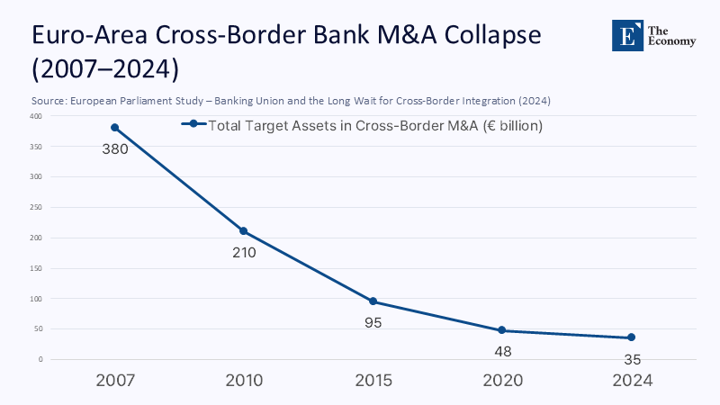 Cross‑border consolidation is not merely lagging; it is moribund. The European Parliament's 2024 study reveals that aggregate target assets in euro-area bank mergers and acquisitions (M&A) have plummeted from €380 billion in 2007 to below €35 billion in 2024. Madrid's July 2025 decision to block the BBVA-Sabadell merger highlighted the political chokepoints, prompting Brussels to issue an infringement notice but failing to erase the market signal that national vetoes prevail over integration. Ring-fencing compounds the inertia: supervisory waivers exist on paper, yet finance ministries routinely override them in moments of stress, forcing banks to hoard excess capital locally and turning off the very shock absorption that a monetary union requires.