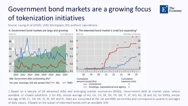 Tokenised debt tends to inspire grand narratives about programmable finance and real‑time sovereign monetary integration. Yet the complex data advise a narrower lens. Tokenisation’s defining contribution to date is profoundly prosaic: it shrinks spreads by lowering search, inventory, and information costs. Permissioned ledgers reduce minimum tradable sizes—USD 110,000 versus USD 185,000 for comparable paper notes—unlocking participation from regional dealers and boutique asset managers that were previously priced out of benchmark issues. With more eyes on the order book, market depth flattens, and the risk premium dealers once charged for exposing resting quotes erodes.