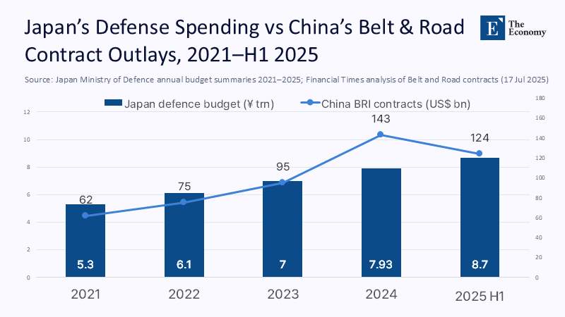 Japan will spend ¥8.7 trillion (≈ US$55 billion) on defence in FY 2025—its thirteenth consecutive annual rise and a 9.7% leap over last year. Yet, on the very same calendar page, Chinese state-owned firms signed US$124 billion in Belt and Road contracts in just the first six months of 2025, a record surge. Meanwhile, only 37.5% of Taiwanese now believe the United States would intervene militarily on their behalf, a seven-point decline in nine months. The triad of numbers lands like a warning flare: Beijing's economic reach is racing ahead, Washington's reliability is slumping, and Tokyo has answered with its largest armament drive since 1945. If security is an equation of capability multiplied by credibility, the variable most in flux is no longer hardware but alliance trust. In that vacuum, a strengthened UK–Japan axis emerges not merely as a hedge but as the keystone that rebalances deterrence in the western Pacific.