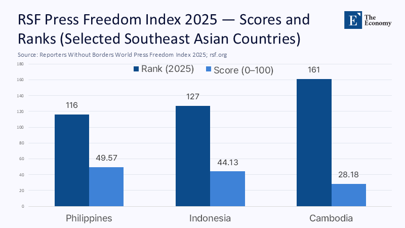 RSF. (2025). World Press Freedom Index 2025 global overview; Philippines at 116/180; Indonesia at 127/180; Cambodia at 161/180.