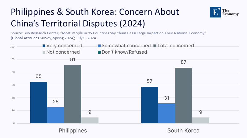 In 2024, 91% of Filipinos said they were concerned about China's territorial disputes—65% "very concerned." That single number captures a regional mood—and a policy inflection—better than any slogan about "great-power competition." It is not an abstraction: over the past two years, the China Coast Guard has repeatedly blasted Philippine vessels with water cannons and rammed them near Second Thomas Shoal and Scarborough Shoal, injuring sailors and damaging boats; just yesterday, Manila blamed China for yet another collision near Scarborough. In response, the Philippines accelerated access for US forces at nine Enhanced Defense Cooperation Agreement (EDCA) sites—several oriented toward the Taiwan Strait and the Spratlys—while hosting its largest-ever Balikatan exercises. South Korea reads this same barometer from a different vantage point: its security is anchored by ~28,500 US troops and newly formalized trilateral mechanisms with Washington and Tokyo, yet its economic arteries still run through China even as trade shares quietly tilt toward the United States. The lesson is not "choose a side," but match exposure to function: maritime denial for Manila; supply-chain de-risking for Seoul.
