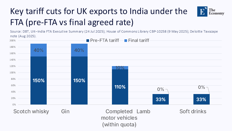 The government’s modelling quantifies those gains. It estimates a long-run increase of 0.13% in UK GDP (about £4.8 billion) and a 39% rise in bilateral trade, with import-duty savings for UK exporters of roughly £400 million at entry into force and around £900 million after 10 years of staging. Whisky tariffs fall from 150% to 75% immediately, then to 40% after staging; motor-vehicle tariffs drop to 10% within quotas. On the import side, the UK consumer benefits from cheaper textiles and apparel. At the same time, domestic output in those segments falls modestly—about 0.7% relative to no-deal—freeing resources for sectors with larger export gains. This is how modern FTAs deliver broad gains: by lowering input costs, expanding export headroom, and reallocating capital and labour toward higher-productivity activities.