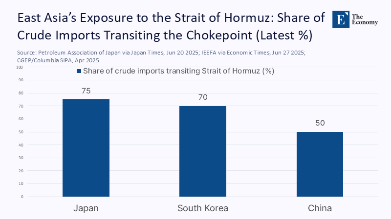Japan is the regional extreme case in terms of concentration risk. About 95 percent of crude comes from the Middle East, with about three-quarters shipped via Hormuz. Recent trade data shows more than 95% of refinery raw materials from Middle Eastern suppliers in the 1st half of 2025, despite modest purchases from the United States. Japan's oil production is negligible, nuclear restarts are gradual, and LNG provides electricity, but it cannot quickly stop transport fuels or naphtha. The currency's weakness amplifies the vulnerability by making dollar energy more expensive in yen terms. In conclusion, the Tokyo Fair is immediate, mechanical, and challenging to compensate for financially fully.