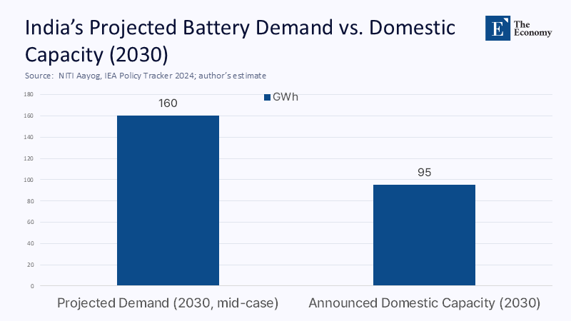 India brings three decisive assets: scale, speed, and a trade architecture already aligned with Australia. On scale, India's economy is set to remain the world's fastest-growing large market, with the IMF and New Delhi both pointing to growth above 6% through the mid-2020s. On energy and mobility, India targets 500 GW of non-fossil capacity by 2030. It has crossed the 220 GW renewable mark, while EV sales are accelerating from a low base—over two million units in FY2024-25 across segments, dominated by two- and three-wheelers. This trajectory implies a steep ramp in cell demand: policy studies place 2030 battery needs between roughly 145–260 GWh, far outstripping today's announced domestic capacity under production-linked incentives. That gap is exactly where Australian offtake and processing partnerships plug in.